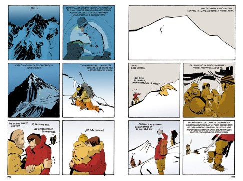 Hace dos años Sua Edizioak y Mendi Film Festival decidimos recoger la hazaña en formato cómic, y así, de la mano de las ilustraciones de César Llaguno y del relato cuidado de Ramon Olasagasti nos asomamos a los fríos aires del Himalaya, pisamos sus nieves perpetuas, los hielos y rocas, vimos las avalanchas, los malos humores de la montaña más alta del planeta. Ascendimos al collado sur, descendimos de nuevo cuando no pudimos continuar. Seguimos con la vista la chaqueta naranja de Martin y dejamos que resbalará entre nuestros dedos el rosario que los polacos habían dejado en la cumbre, la prueba irrefutable de que todo un pueblo había hecho cumbre.