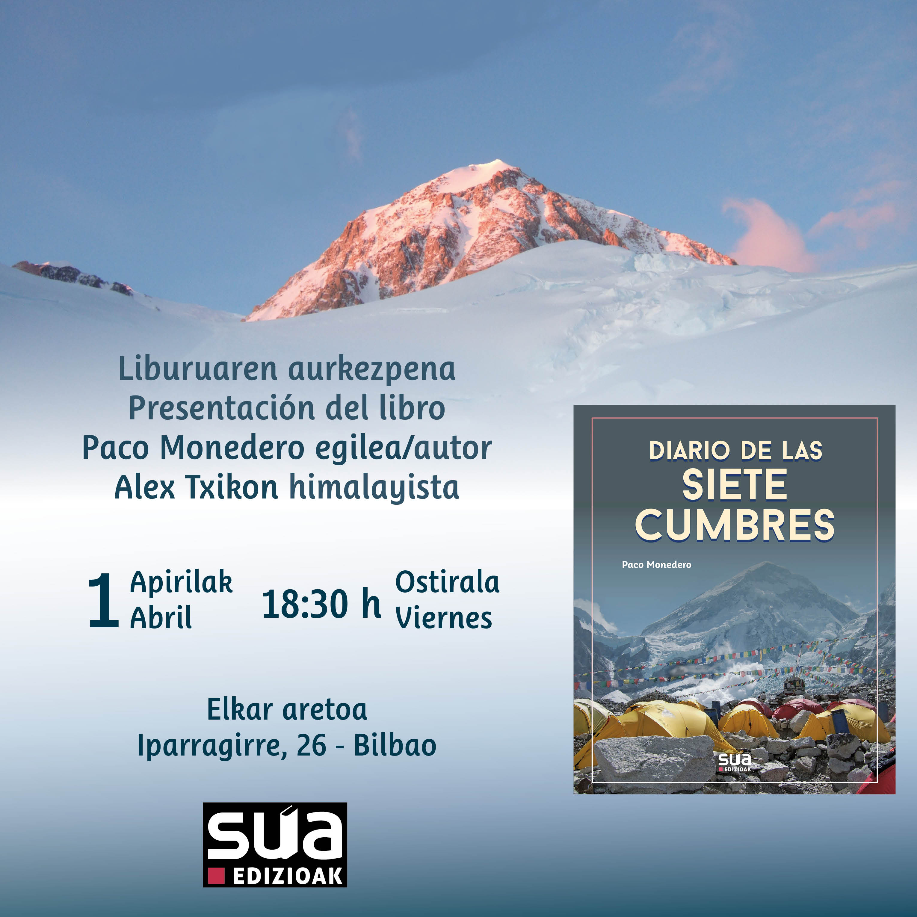 Mañana viernes, 1 de abril, tendremos ocasión de escuchar sus palabras. Nos presentará su libro, además de el documental que rodó al hilo de su experiencia, y firmará libros a los presentes. La cita es en la librería Elkar (Iparragirre, 26) de Bilbao, a las 18:30 h. Nos acompañará el alpinista Alex Txikon, que sabe mucho de retos en la montaña, será quien dé paso a Paco. Con él ha compartido Paco Monedero estancias y momentos en algunos campos base. ¿Te apuntas? Te esperamos.